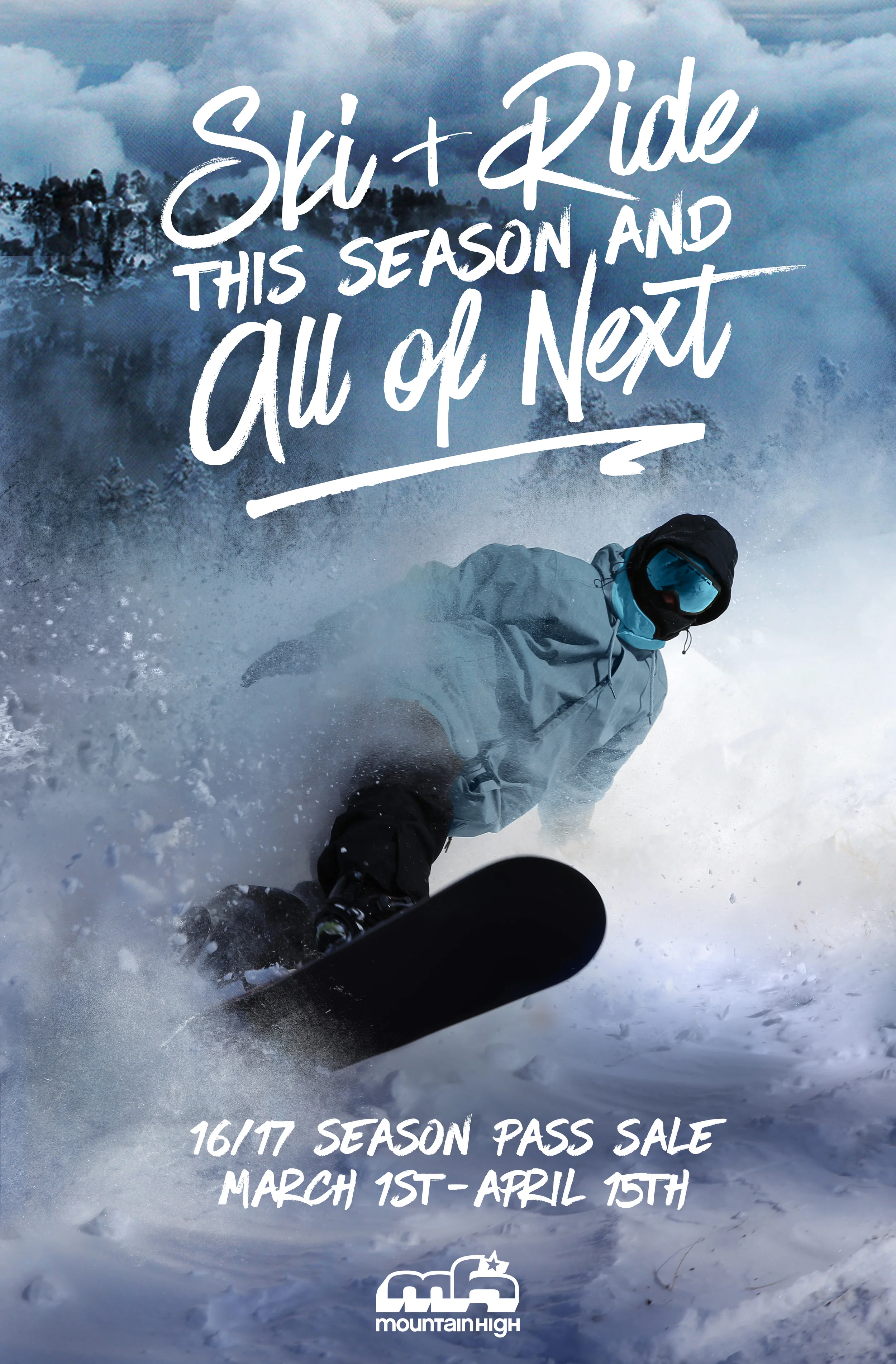 An 11x17 poster design for Mountain High's 2016/2017 Season Pass campaign. Our marketing director wanted to use this specific photo but we needed to add a sweeping mountain shot of the resort as well as manipulate the colors to match our branding.