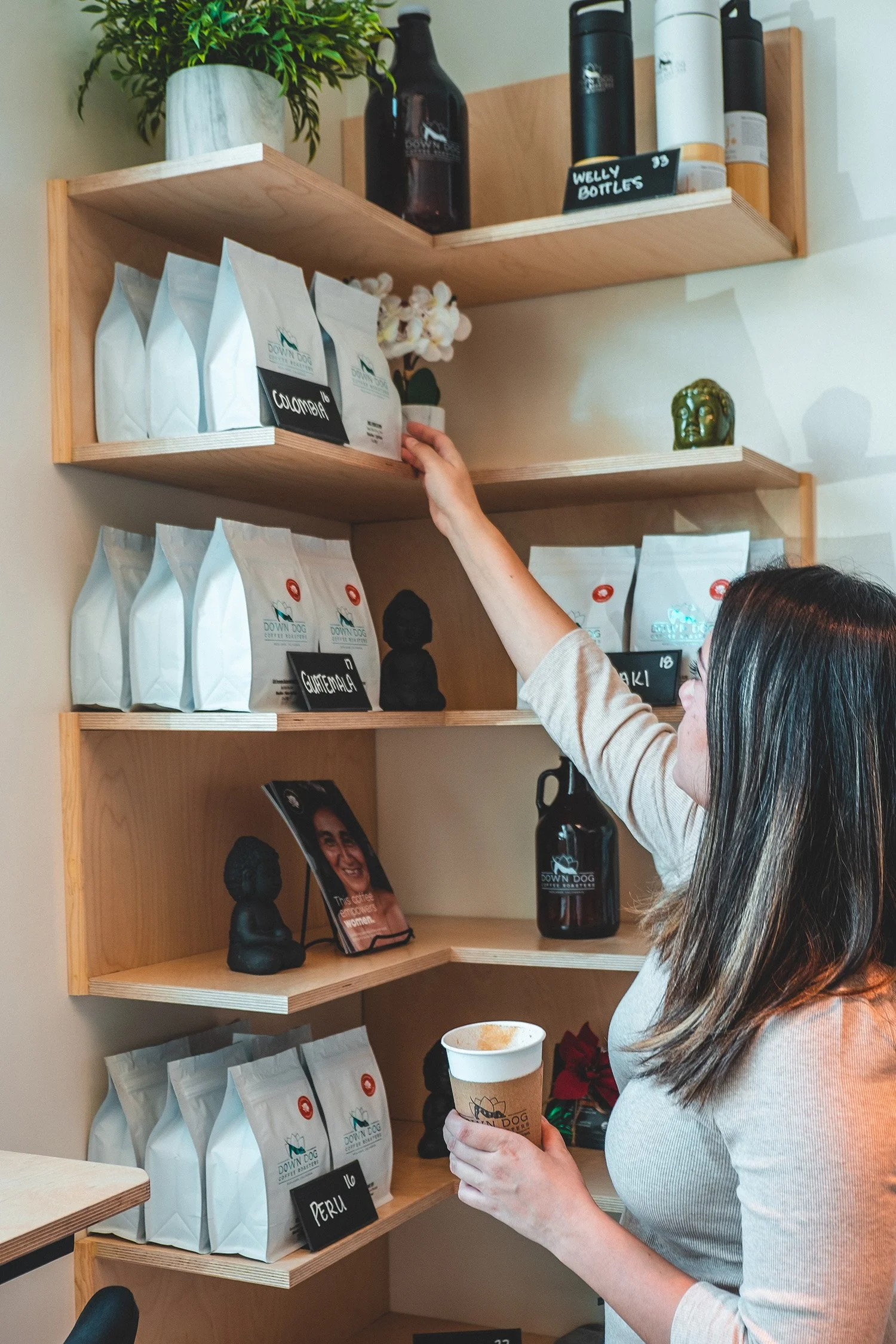 Down Dog Coffee Roasters is an independent coffee shop and roastery located in Redlands, California. Their owners Glenna and Dustin are active yoga aficionados and felt the ‘down dog’ pose provided the most relaxation, and using that visually in their logo best described their coffee experience. The small shop needed a clean, flexible brand that could grow along with them, and I provided the logo, pattern, and packaging. The packaging has a large empty space in the center so they could print out their own coffee labels in-house to help keep costs down.